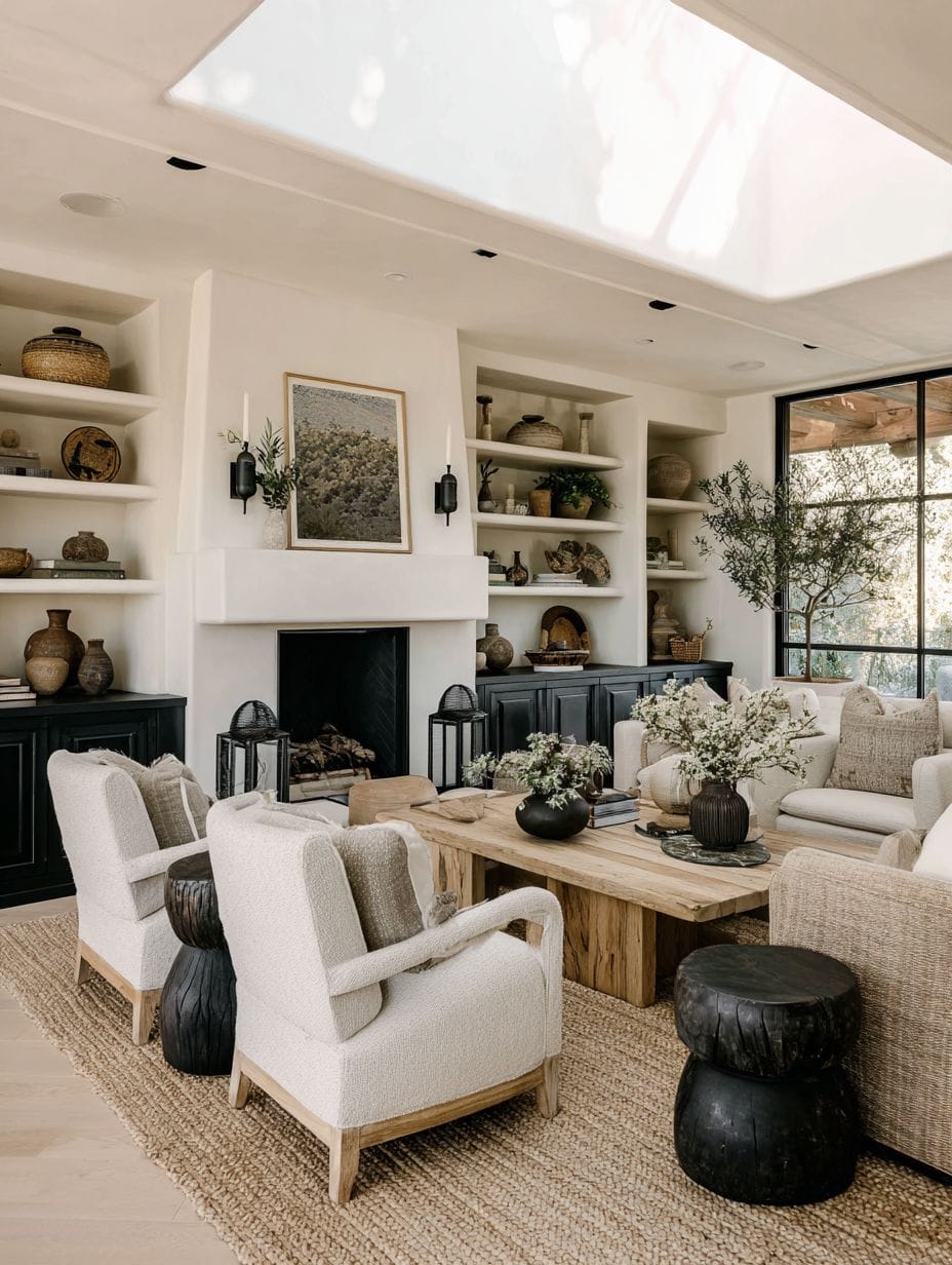 Built-in wooden shelving painted in warm white becomes the star of this modern boho living room, demonstrating how architectural features can be transformed into design statements through thoughtful styling. The shelves are arranged with a carefully edited collection of leather-bound books, their spines creating rich brown tones that contrast beautifully with the white background. Rather than organizing books by size or color in a rigid manner, they’re arranged with an artful casualness—some standing upright, others stacked horizontally—that feels natural and lived-in while maintaining visual balance.