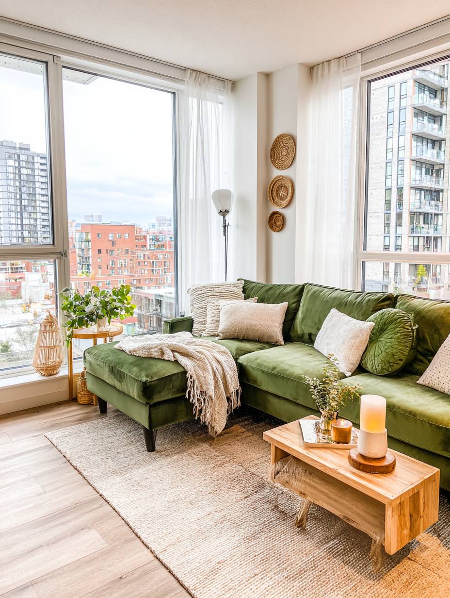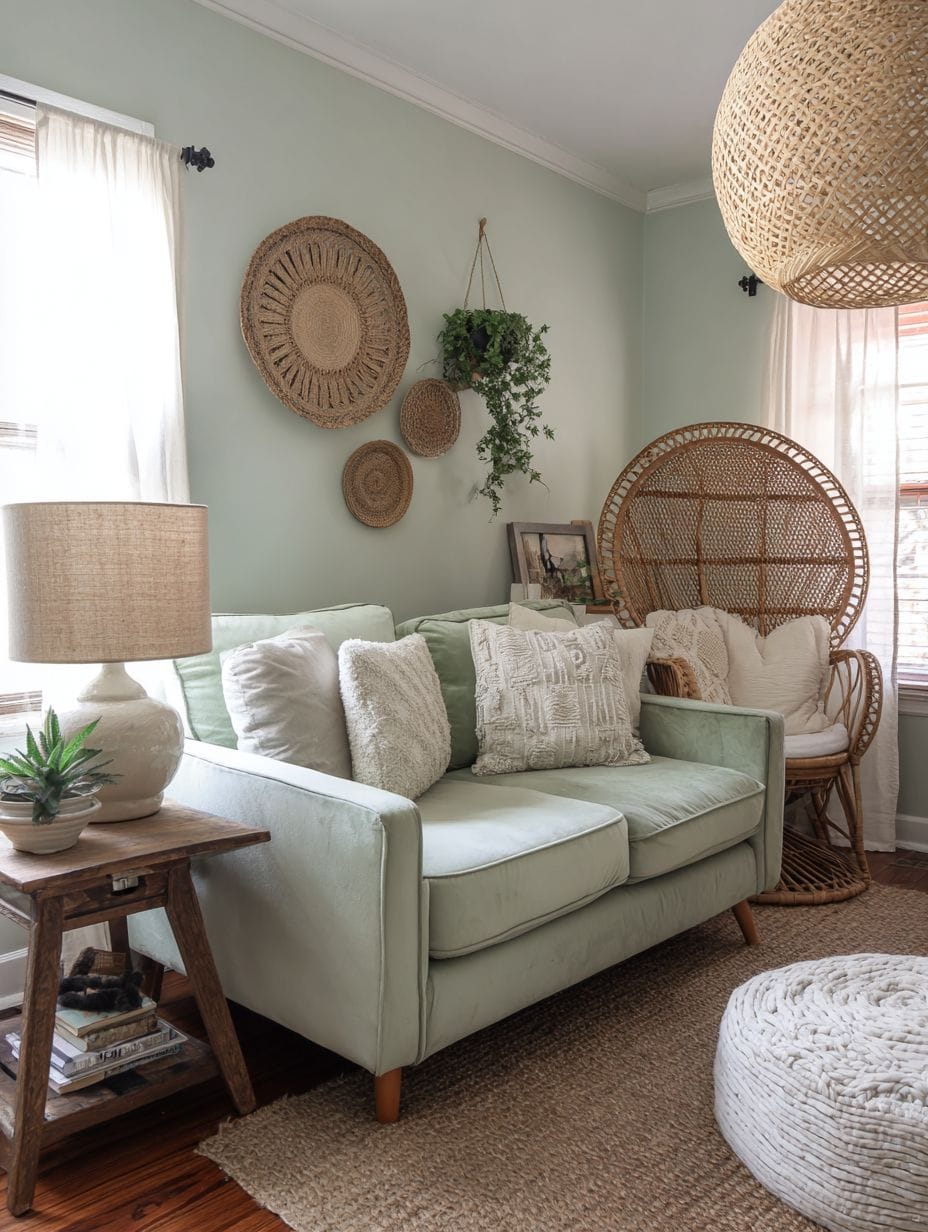 This living room celebrates furniture mixing, pairing a contemporary loveseat in sage green velvet with a natural rattan peacock chair to create an eclectic yet cohesive seating arrangement. The sage green velvet brings color and luxury—its soft pile and subtle sheen catching light beautifully—while its contemporary silhouette maintains modern sensibilities. This piece represents the modern side of modern boho: clean-lined, well-constructed, and sophisticated. In delightful contrast sits the peacock chair, that iconic bohemian furniture piece with its dramatic fan back and natural rattan construction that speaks to global craftsmanship traditions and 1970s boho revival.