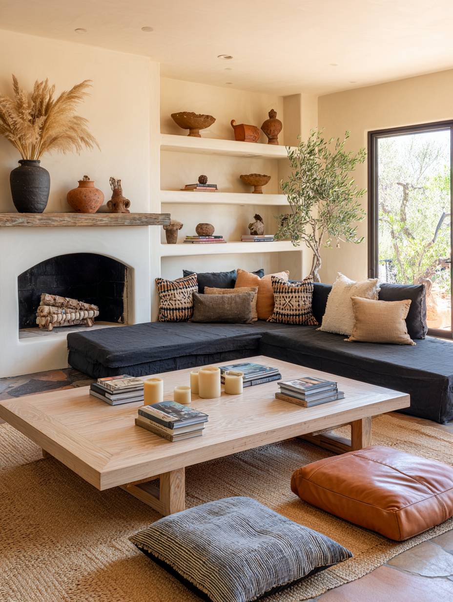 A low-profile sofa in charcoal linen centers directly in front of the fireplace, its contemporary silhouette and dark neutral tone providing visual anchor without competing with the architectural feature. The low back maintains open sightlines and doesn’t block the fireplace wall, an important consideration in furniture placement. This sofa is layered with cushions in earth tones—terracotta, ochre, cream, and sage—colors that echo the natural elements displayed on the fireplace shelf and create warmth against the cooler charcoal base. An oversized floor cushion in leather provides flexible additional seating, its casual placement and natural material embodying bohemian relaxed living within the minimalist framework.
