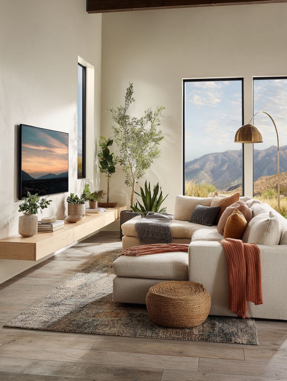 The contemporary sectional in neutral fabric faces this media wall, positioned at an appropriate viewing distance for comfortable television watching. This sectional is layered with pillows and throws in earthy tones—rust, ochre, sage, and cream—that introduce bohemian color and texture without competing with media viewing. A single brass arc floor lamp curves gracefully over one section of the sofa, providing adjustable reading light that doesn’t interfere with television viewing. A tall potted plant anchors the corner, its vertical foliage adding living drama and creating visual balance with the horizontal lines dominating the media wall. Natural light from side windows ensures the space remains bright during daytime hours, preventing the media focus from making the room feel dark or cave-like. This design successfully integrates modern entertainment requirements with bohemian warmth and natural materials, creating a living room that supports contemporary lifestyle needs while remaining beautiful, calm, and connected to nature.