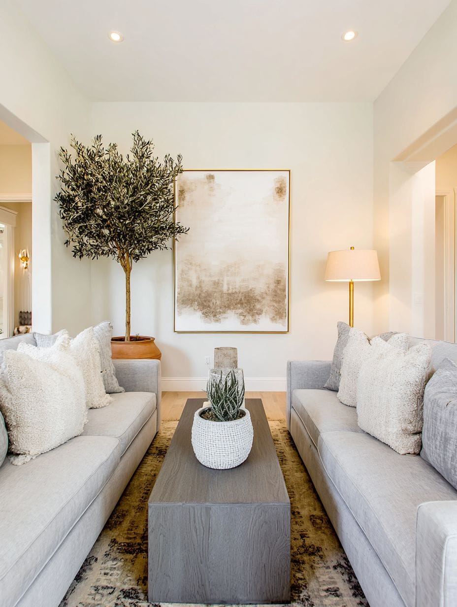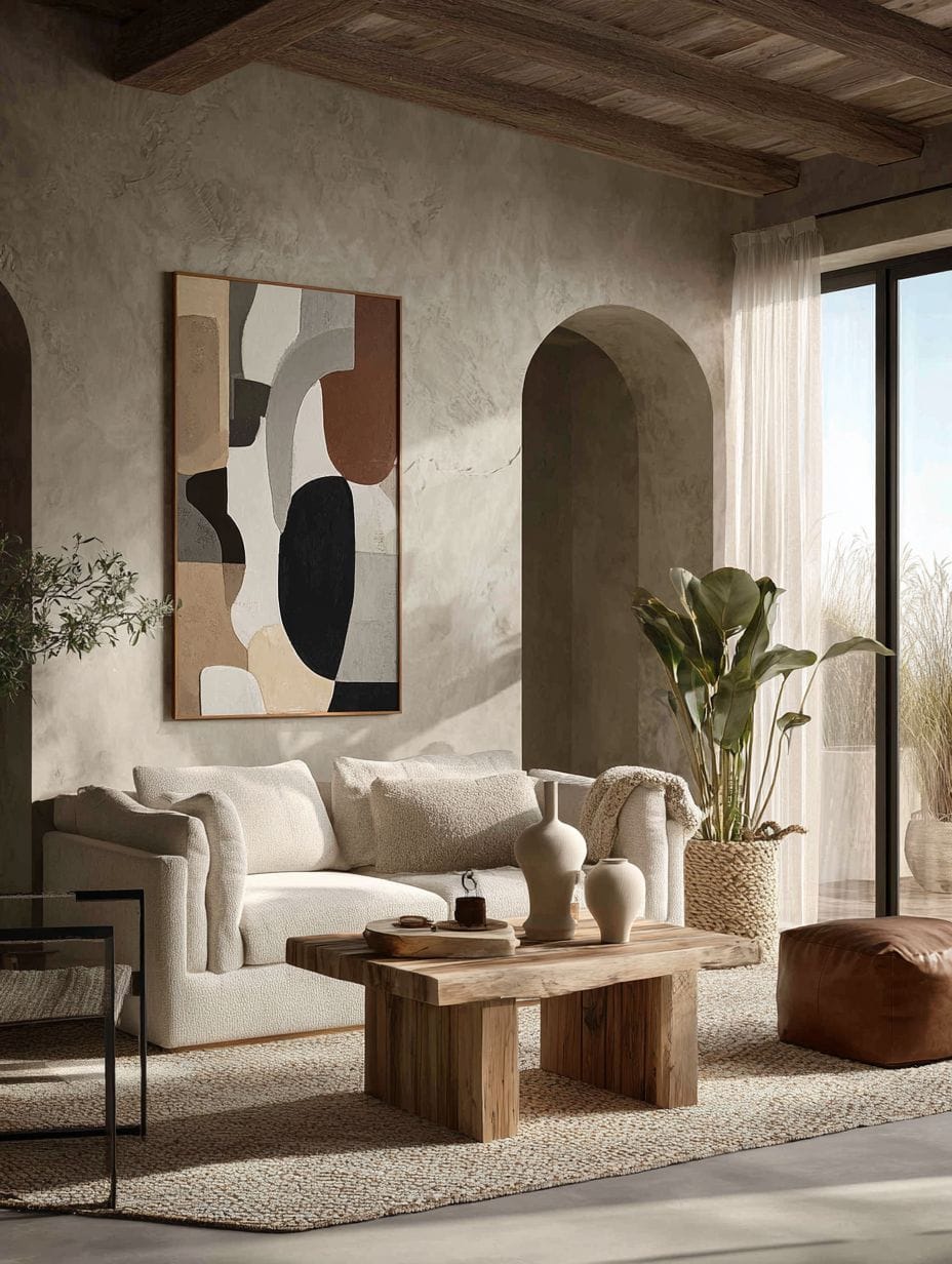A brass floor lamp with a simple drum shade provides task lighting for reading or evening conversation, its warm metallic finish adding a touch of elegance and reflecting light beautifully. On the wall hangs a single large-scale abstract art piece in earth tones—ochre, terracotta, cream, and charcoal—that ties together the colors found throughout the space while providing a substantial focal point that balances the symmetrical seating arrangement. A potted olive tree in a terracotta planter adds organic verticality and living greenery, its Mediterranean origins and sculptural branching structure making it both a plant and an art piece. This design proves that symmetry and formality can coexist beautifully with bohemian warmth when textiles and natural elements are thoughtfully integrated.