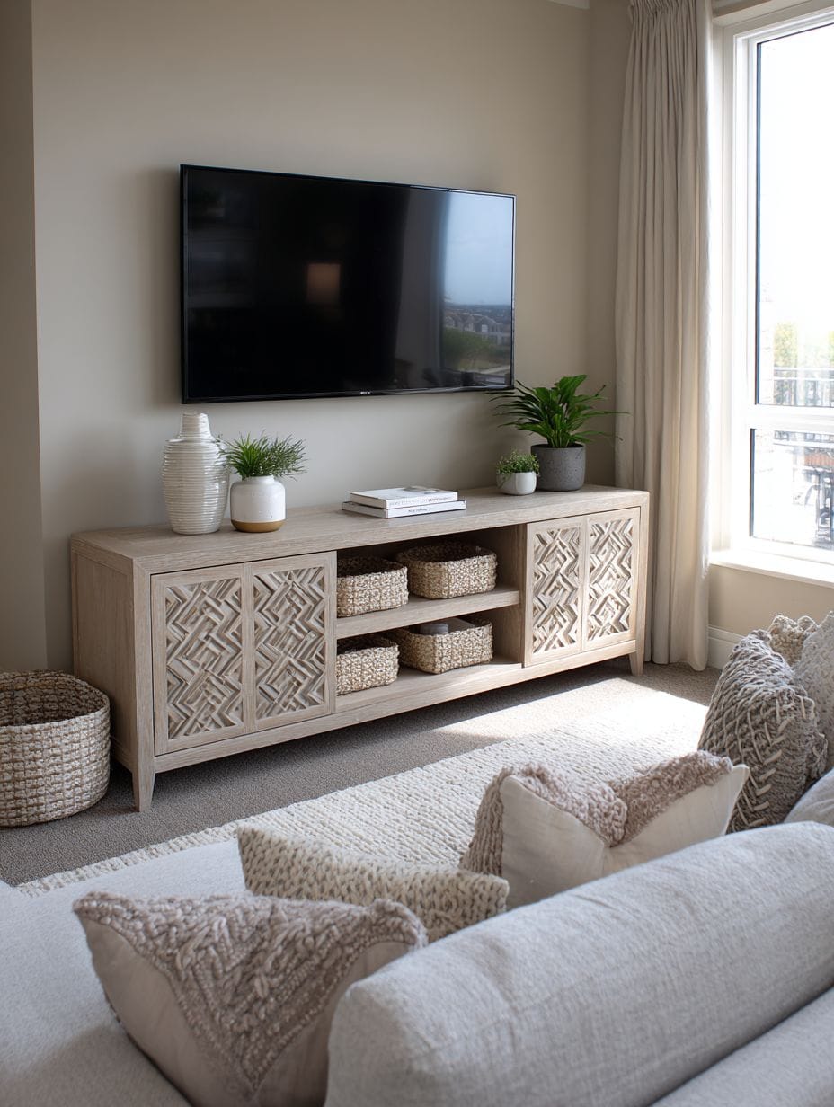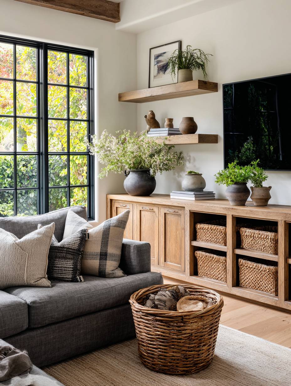 - Conceal media accessories in woven baskets that serve both function and aesthetic purposes.