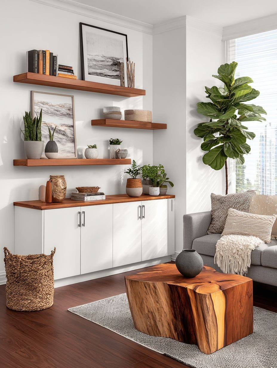 Open wooden shelving provides both function and opportunity for personal expression in this design. Rather than closed cabinetry that hides belongings, these shelves display a carefully curated collection of plants in varied ceramic pots, books arranged both vertically and horizontally for visual rhythm, and artisan ceramics that reflect the homeowner’s travels and tastes. A pendant light with a woven seagrass shade hangs above, casting dappled shadows that change throughout the day as natural sunlight streams through large windows. This interplay of natural and artificial light sources creates an ever-changing ambiance that keeps the space feeling alive and dynamic.