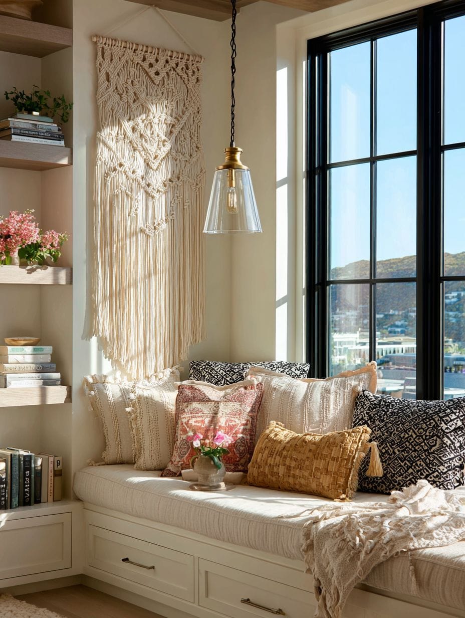 A modern pendant light with brass finish hangs nearby, positioned to provide task lighting for evening reading or activities. The warm brass tone adds elegance and reflects both natural and artificial light beautifully, creating gentle illumination that enhances rather than overwhelms the space. On the adjacent wall, a large macramé wall hanging introduces significant textural dimension and handcrafted bohemian character, its scale appropriately substantial to balance the architectural window seat. Natural daylight floods through the window, illuminating the reading nook and highlighting the interplay of textures present in smooth architectural elements, woven textiles, and knotted macramé. This design proves that modern boho excels at creating architectural features that integrate storage, seating, and display in ways that are both beautiful and highly functional for contemporary living.
