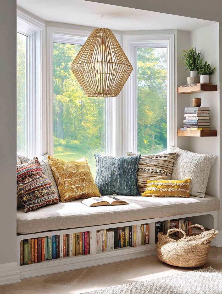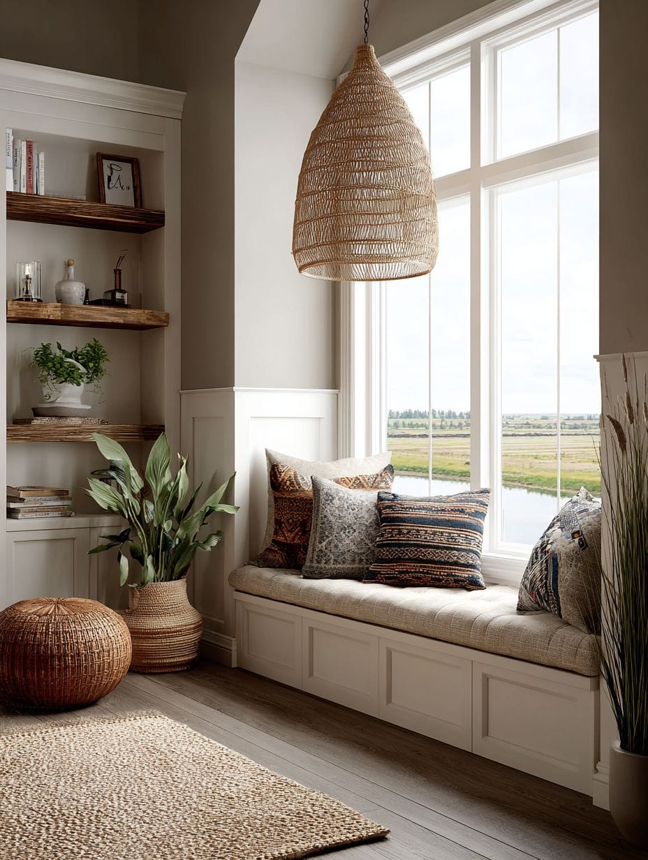 This design carves out a dedicated sanctuary for reading and quiet contemplation, demonstrating how modern boho principles can create functional micro-environments within larger living spaces. A built-in window bench positioned to capture natural light features a cushioned seat in natural linen, its neutral tone and breathable fabric creating comfort without visual weight. The bench’s built-in design maximizes space efficiency—a modern consideration—while the cushioning and textile choices add bohemian softness and comfort. This built-in approach also provides architectural interest and a sense of permanence that freestanding furniture cannot achieve.
