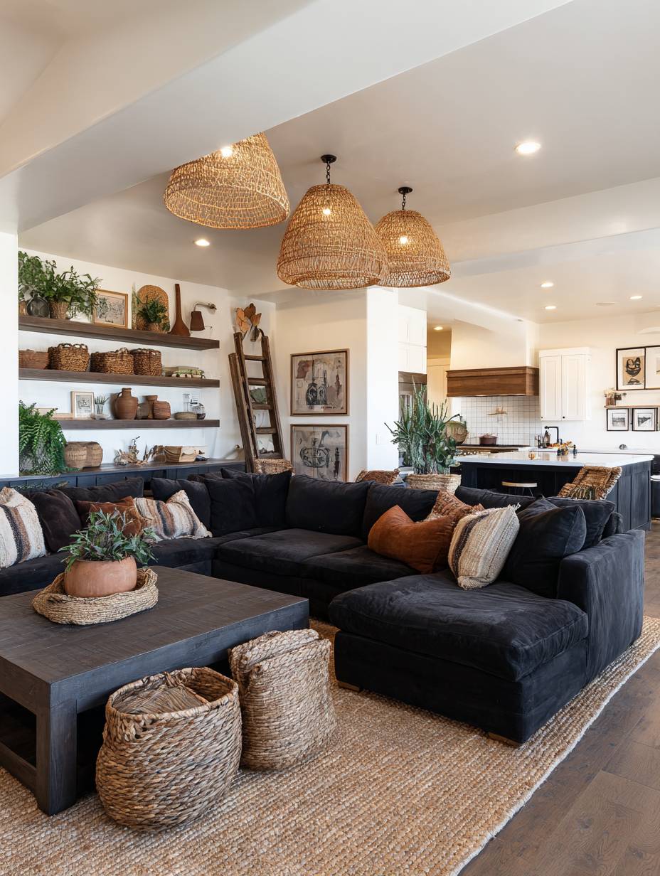 - Use woven baskets for concealed storage that hides clutter while adding bohemian texture.