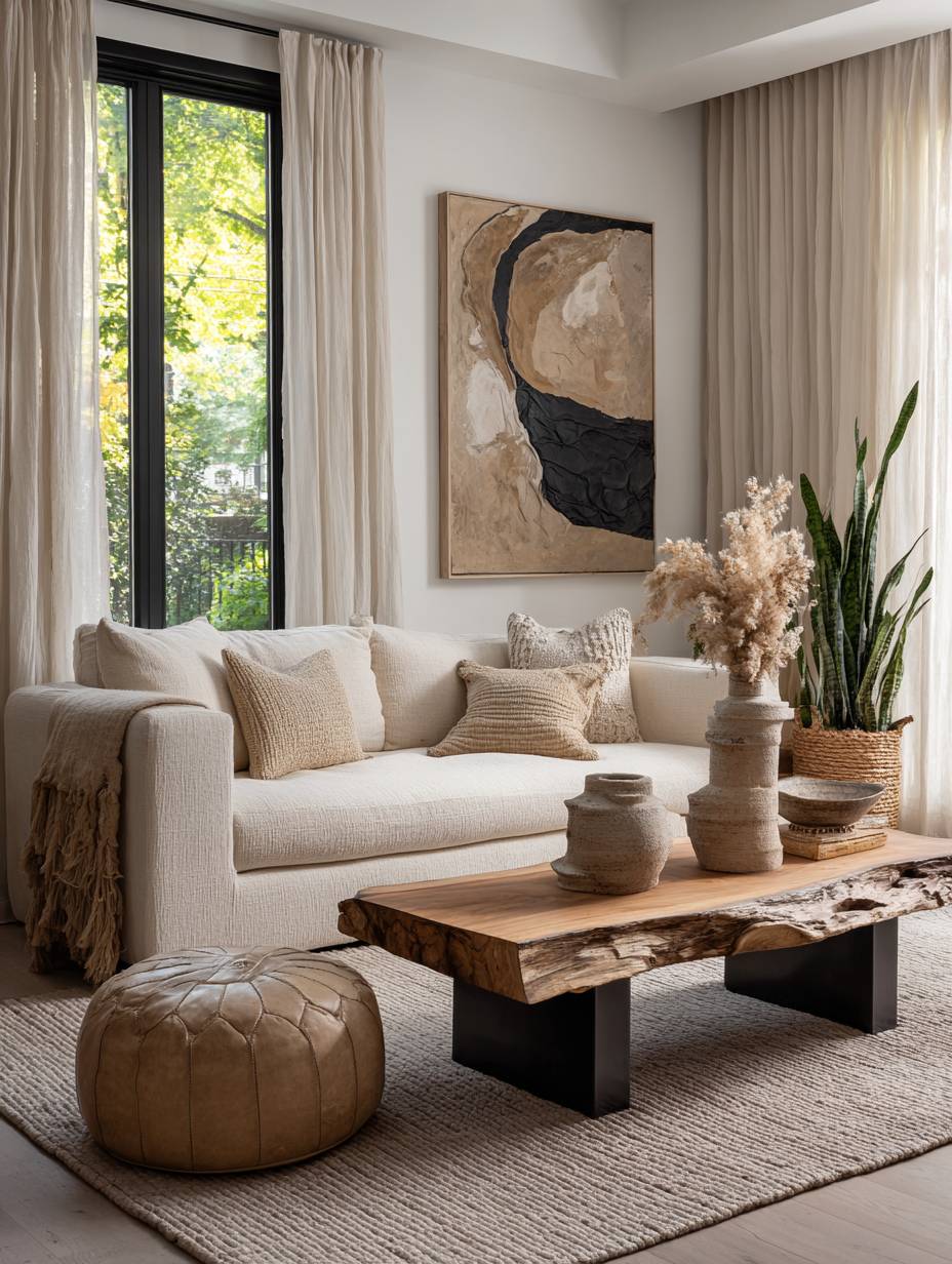 A single large-scale photograph in a simple frame hangs on the white wall, its substantial size providing visual impact without requiring multiple artworks. This minimalist approach to wall decoration maintains breathing room and prevents visual clutter, allowing the photograph to be truly appreciated. Hanging plants in ceramic planters add greenery and organic movement without consuming floor space—an efficient approach in smaller living rooms. Natural light through tall windows illuminates the space throughout the day, highlighting the varied textures present in linen upholstery, woven textiles, ceramic surfaces, and living plants. This design demonstrates how modern boho can celebrate global craftsmanship and cultural diversity while maintaining the clean lines and uncluttered spaces that contemporary living requires.