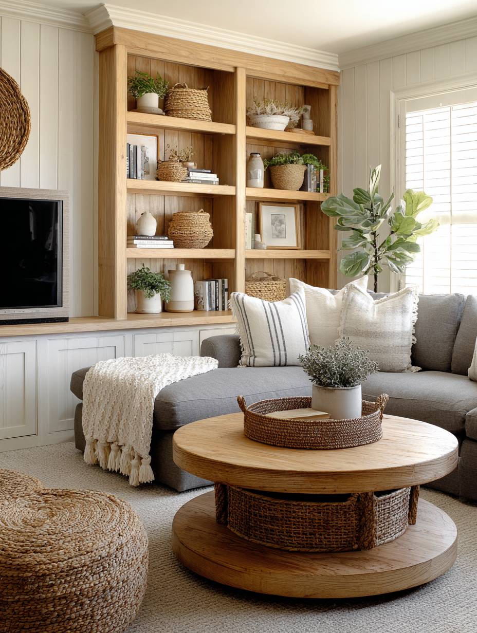 This design addresses the modern necessity of television and media storage while maintaining both aesthetic appeal and bohemian warmth—a challenge many living rooms face. The media console in natural oak features clean geometric design that satisfies contemporary tastes while the wood material and visible grain bring organic warmth characteristic of bohemian style. The console’s design includes both open and closed storage, with woven baskets tucked into open cubbies providing concealed storage that’s both functional and textural. These baskets serve the dual purpose of hiding electronics and clutter while introducing handcrafted elements that soften the harder lines of the wooden console.