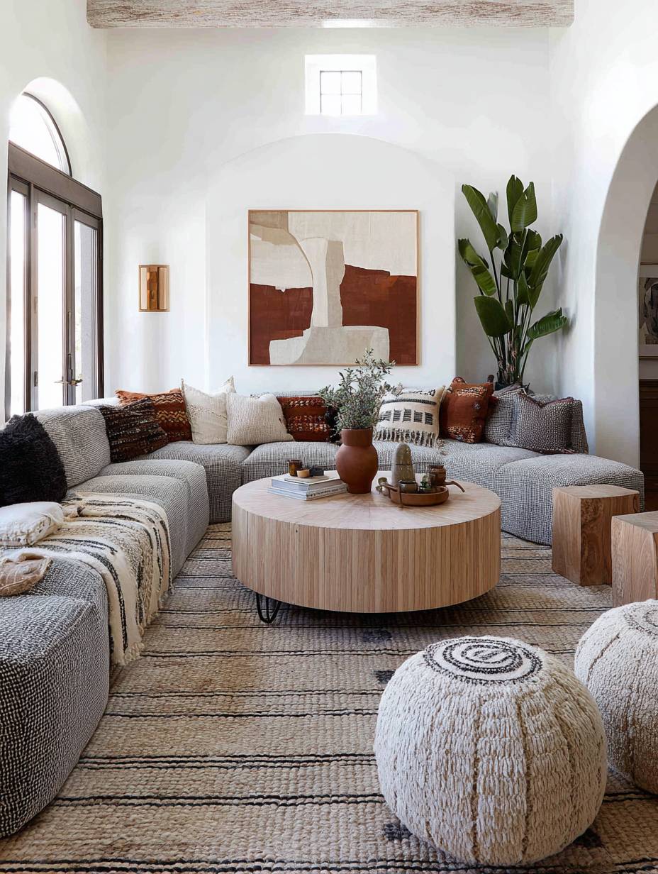 This living room showcases the beauty of modular sectional furniture in modern boho design, with grey fabric pieces that can be rearranged to suit different social configurations and spatial needs. The modular nature of the seating is distinctly modern—flexible, adaptable, and practical for evolving living situations. The neutral grey fabric provides a calm foundation that won’t compete with the more colorful and textured elements layered upon it. These sectional pieces create an intimate conversation area around a round wooden coffee table with hairpin legs, that mid-century modern detail that has become a staple in contemporary bohemian spaces.