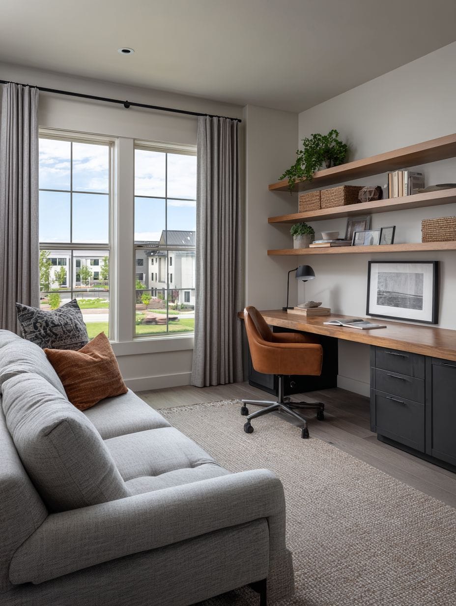 - Use open shelving above workspaces for dual-purpose display and functional storage.