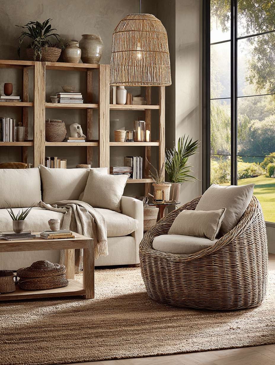 - Choose lighting fixtures made from natural materials like seagrass or rattan to reinforce the organic aesthetic.