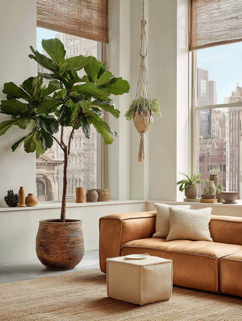 A tall fiddle leaf fig in a woven basket planter commands attention in one corner, its substantial size and dramatic foliage creating a living sculpture that brings life and vertical drama to the space. From the ceiling hangs a macramé plant hanger suspending additional greenery, utilizing vertical space efficiently and adding bohemian craftsmanship without cluttering surfaces. Minimalist shelving displays a small succulent collection and neutral ceramic vessels—each item carefully chosen and given space to breathe. A natural jute rug provides textural foundation without introducing pattern, maintaining the calm, uncluttered aesthetic. This design demonstrates that modern boho can be achieved with restraint, allowing each carefully chosen element to have maximum impact in a serene, light-filled environment.