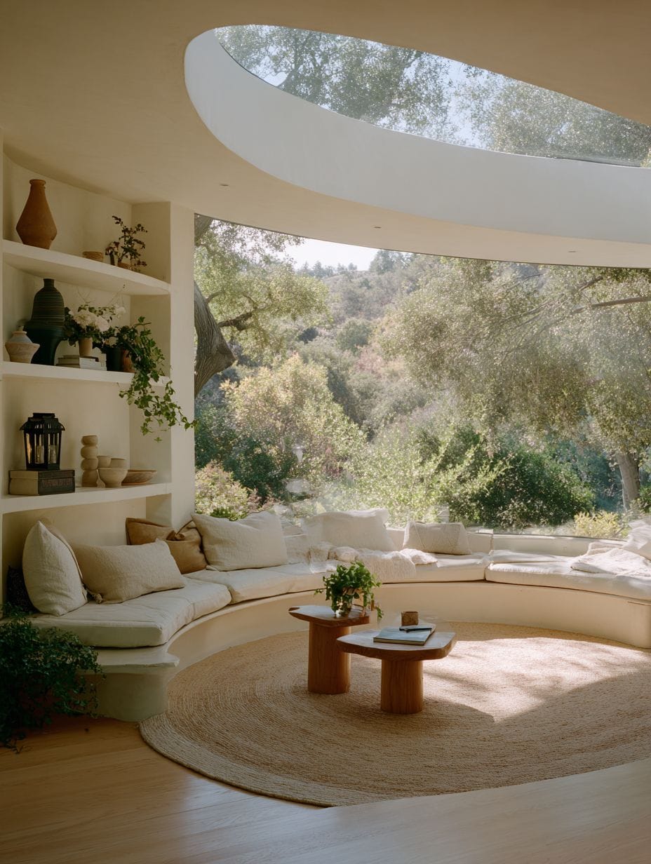 This design features a conversation pit arrangement—a sunken seating area with modular floor cushions in natural linen and leather upholstery that creates an intimate, casual gathering space. This architectural feature is having a renaissance in modern design, appreciated for how it naturally facilitates face-to-face conversation and creates cozy communal spaces. The modular cushions allow for flexible seating configurations that can accommodate intimate gatherings or larger parties, their low profile and floor-level positioning creating a relaxed, informal vibe that’s distinctly bohemian in spirit while the clean lines and quality materials maintain modern sophistication.