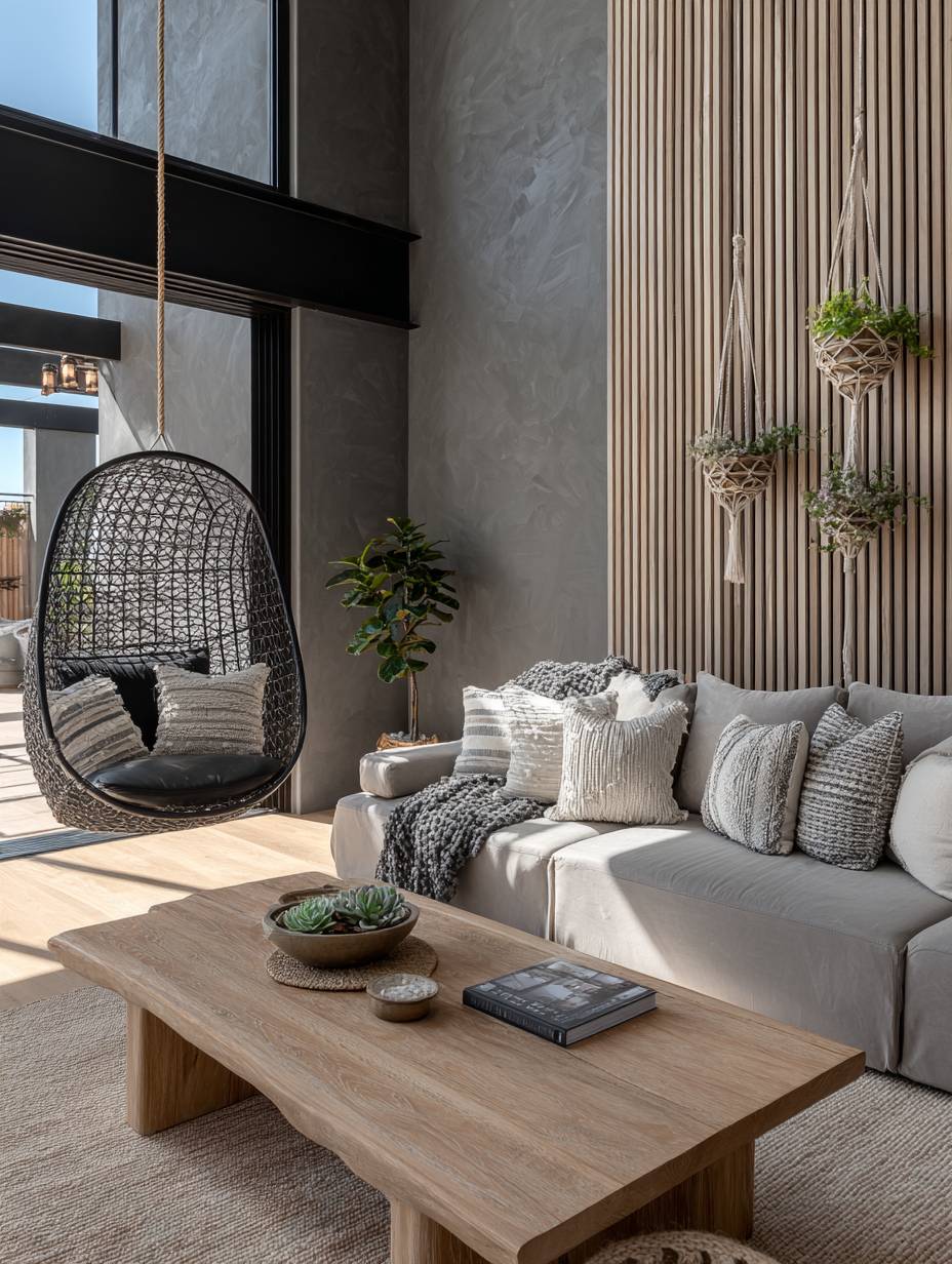 A leather butterfly chair provides additional seating, its iconic mid-century silhouette and natural material connecting multiple design eras and aesthetics. The butterfly chair’s portable nature and sculptural form make it both practical and artistic—it can be repositioned as needed while providing visual interest even when unoccupied. A simple wooden coffee table displays coffee table books and a small succulent arrangement, accessories chosen for their sculptural qualities and ability to spark conversation. Hanging plants in macramé holders cascade from above, utilizing vertical space while adding living greenery that contrasts beautifully with the geometric lines of the slatted wall. This design proves that architectural features can serve as the primary design statement in modern boho spaces, with furniture and accessories supporting rather than competing with these structural elements.
