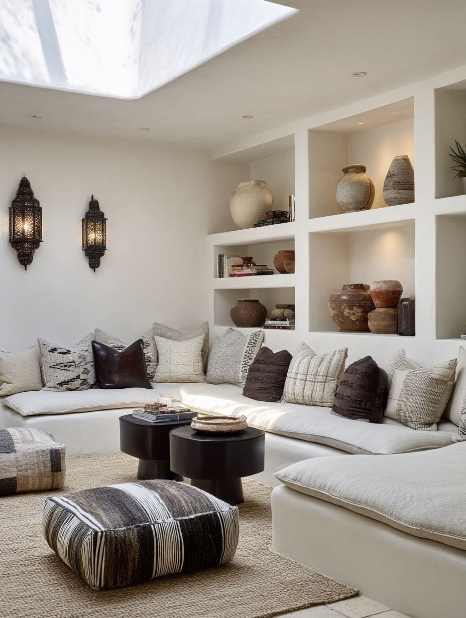 - Balance architectural simplicity with textile richness through pillows and wall hangings.